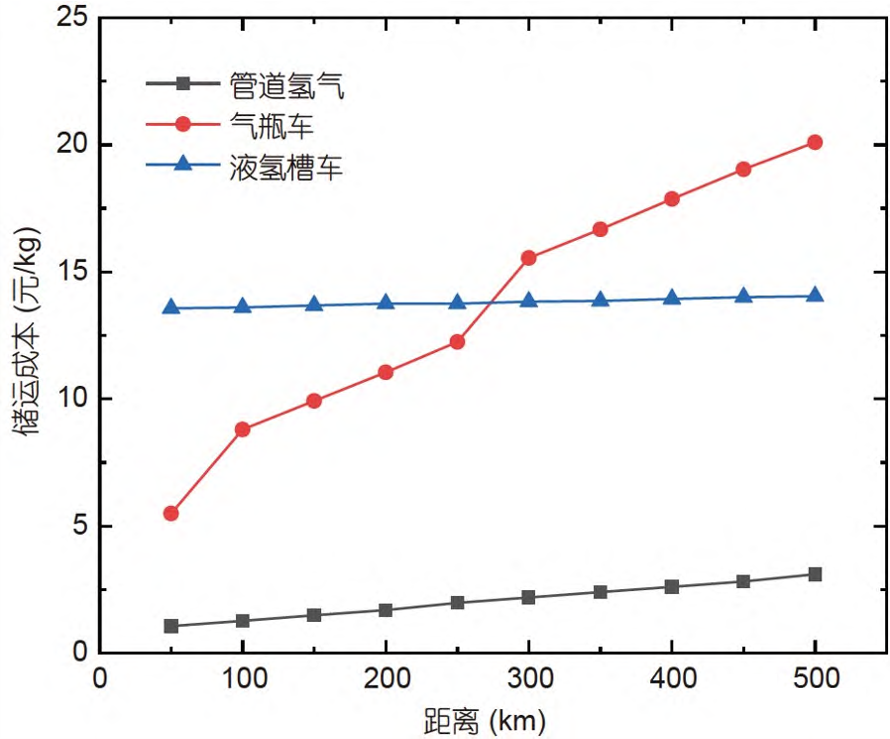 有機液體以及氨氣輸運氫氣也是正在開發的氫氣儲運方法,尤其是在長距離、大規模的氫氣輸送方面具有一定優勢,但是雜質氣體含量高,高純氫氣使用時需要重新純化。固態合金輸氫純度高、安全性好, 但是輸運能耗高、成本高,適合人口密集的區域以及短距離的氫氣輸運。長管拖車輸運氫氣成本隨距離的增加顯著,適合300km以內的輸氫,距離超過300km時,液氫和管道輸氫更合適, 輸氫量越大,這種趨勢越明顯。