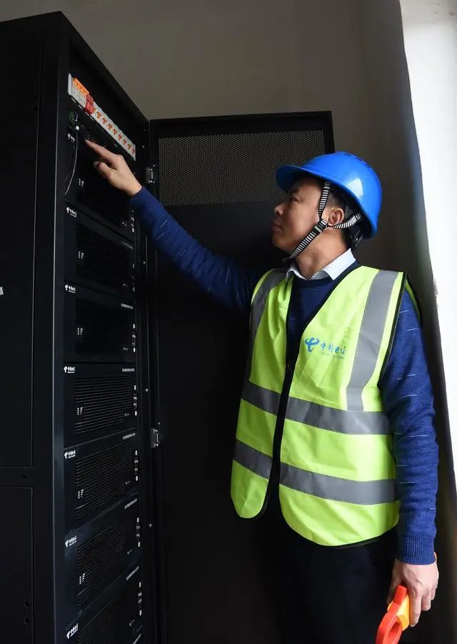 蝴蝶島4G基站建成開通。圖為電信技術人員在測試基站開通后的信號