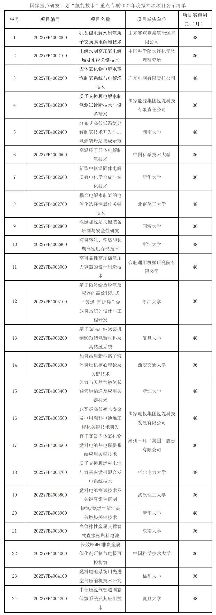 根據《國務院關于改進加強中央財政科研項目和資金管理的若干意見》(國發〔2014〕11號)、《國務院關于深化中央財政科技計劃(專項、基金等)管理改革方案的通知》(國發〔2014〕64號)和《財政部科技部關于印發<國家重點研發計劃資金管理辦法>的通知》(財教〔2021〕178號)等文件要求,現對“氫能技術”重點專項2022年度擬立項項目信息進行公示。