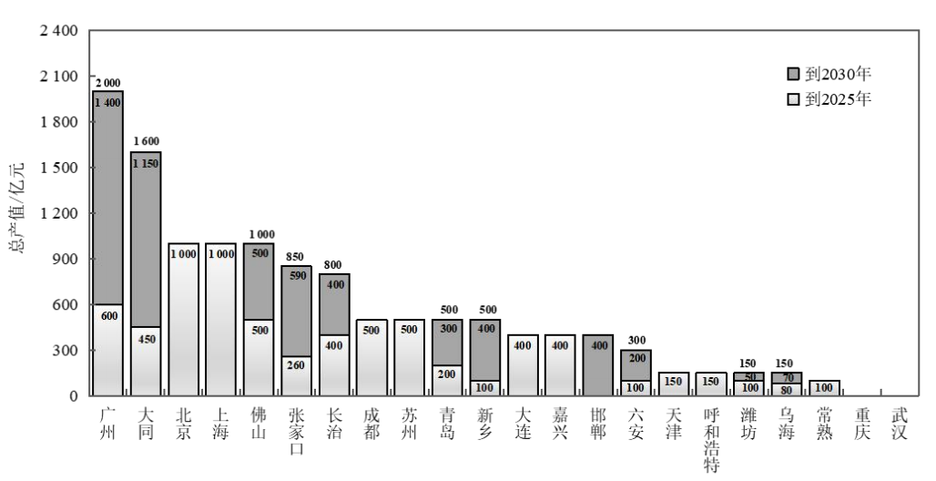 產值目標方面,圖1所示,短期規劃(2025年)出現3個梯隊,第一梯隊為北京、上海、廣州、佛山成都、蘇州,總產值規劃均在500億元及以上,其中北京和上海(2023年)氫能產業總產值最高,達到1000億元;第二梯隊為大同、長治、大連和嘉興等,總產值規劃均在200——500億元之間;第三梯隊為天津、呼和浩特、六安和濰坊等,產值規劃均在200億元以下。長期規劃(2030年)目標,僅有少部分城市在政策規劃中明確長期目標,廣州和大同分別提出了2000億元和1600億元較高的產業長期發展目標,其他城市發展目標不夠清晰。