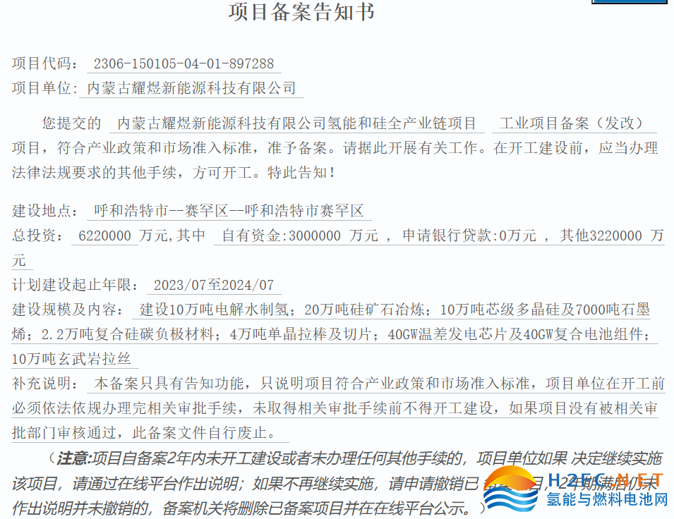 6月8日,內蒙古耀煜新能源科技有限公司氫能和硅全產業鏈項目獲準備案。