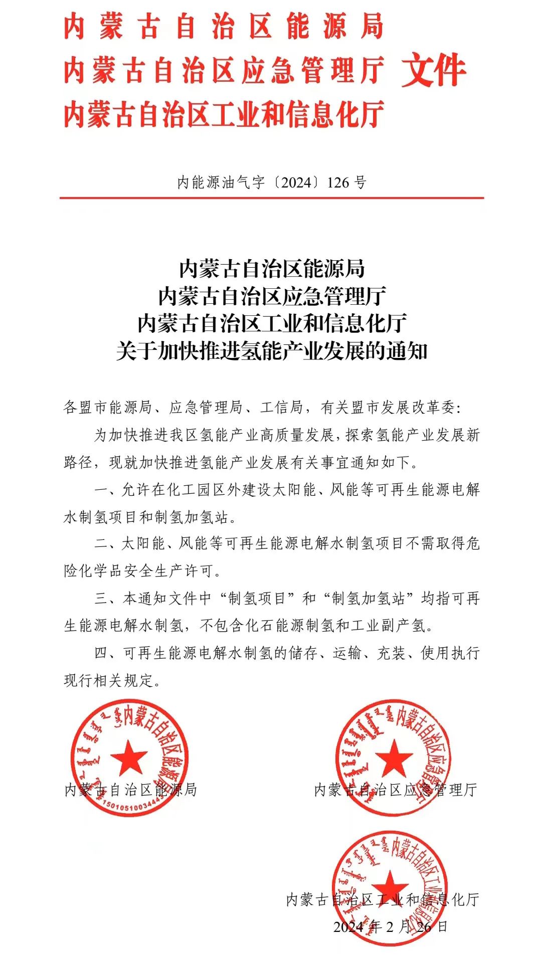 2月26日,內(nèi)蒙古自治區(qū)能源局、應急管理廳、工業(yè)和信息化廳聯(lián)合發(fā)布《關于加快推進氫能產(chǎn)業(yè)發(fā)展的通知》,明確提出允許在化工園區(qū)外建設太陽能、風能等可再生能源電解水制氫項目和制氫加氫站,太陽能、風能等可再生能源電解水制氫項目不需取得危險化學品安全生產(chǎn)許可。
