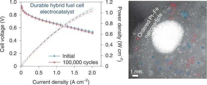 近日,香港科技大學邵敏華教授、南方科技大學谷猛教授和美國阿貢國家實驗室Khalil Amine(共同通訊作者)等人報道了一種由原子分散的Pt和Fe單原子以及Pt-Fe合金納米顆粒組成的混合電催化劑。燃料電池性能測試表明,該電催化劑的Pt質量活性比商用Pt/C的高3.7倍。更重要的是,即使陰極中Pt負載量降低至0.015 mgPt cm-2時,該燃料電池顯示出優異的耐久性,在100000次循環后仍具有97%的活性保持率,并且在0.6 V下運行超過200 h后沒有明顯的電流衰減。這些結果突出了混合電催化劑中活性位點之間協同效應的重要性,并為設計用于電化學器件的更活潑、更耐用的低Pt基電催化劑提供了一種新方法。研究成果以題為“Atomically dispersed Pt and Fe sites and Pt-Fe nanoparticles for durable proton exchange membrane fuel cells”發布在國際著名期刊Nature Catalysis上。