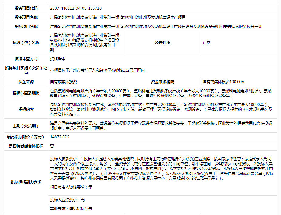 近日,廣晟氫能燃料電池高端制造產業集群一期-氫燃料電池電堆及發動機建設生產項目設備及測試設備采購和安裝調試服務項目一期公開招標公告。