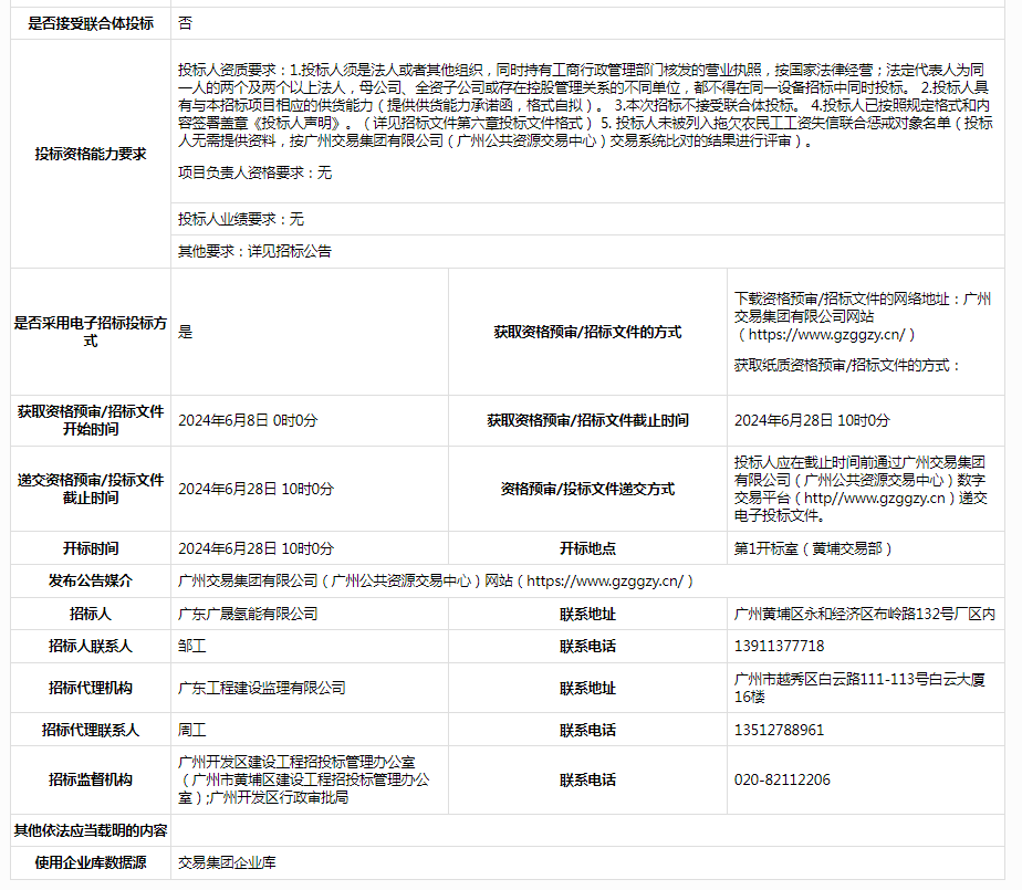 公示結果顯示,廣晟氫能燃料電池高端制造產業集群一期-氫燃料電池電堆及發動機建設生產項目位于廣州市黃埔區永和經濟區布嶺路132號廠區內,最高投標限價14872.676萬元,建設單位有權根據工程實際進度情況要求暫停安裝、工期順延等措施,因此發生的相關費用包含在投標報價中,中標人不得要求再調整。