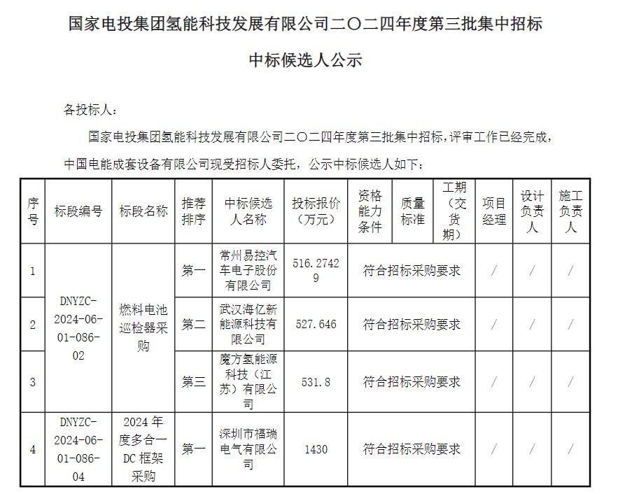 7月16日,國家電投集團氫能科技發展有限公司二O二四年度第三批集中招標中標候選人公示,此次招標包含兩個標段,燃料電池巡檢器采購和2024年度多合一DC框架采購。