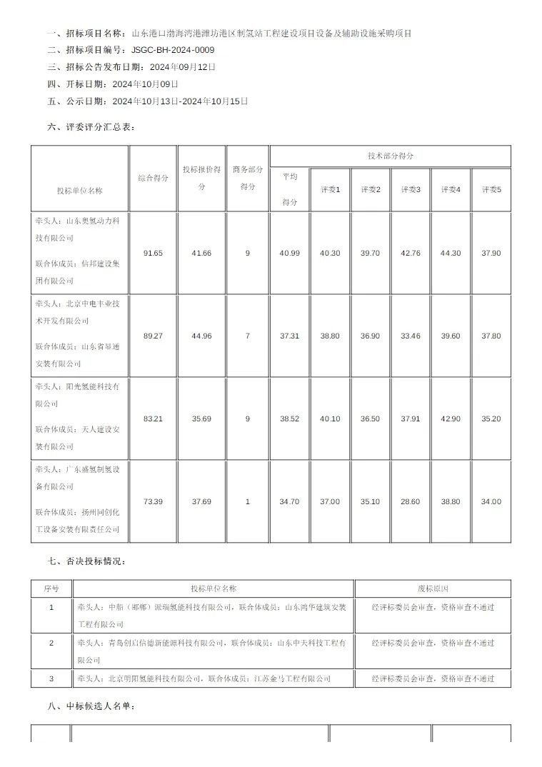 10月12日,山東港口渤海灣港濰坊港區制氫站工程建設項目設備及輔助設施采購項目中標候選人公示。