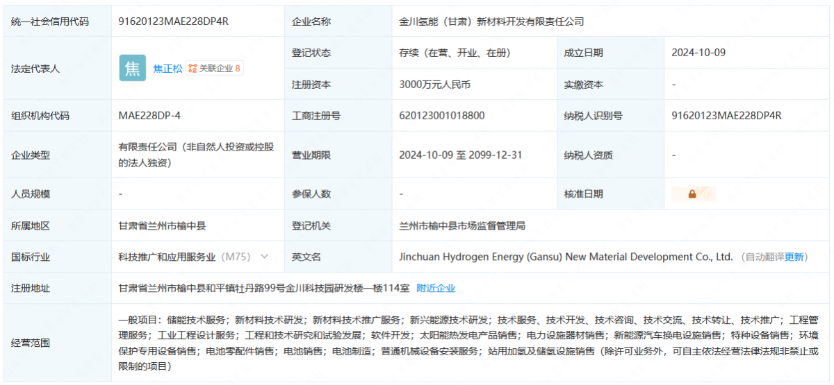 近日,金川氫能(甘肅)新材料開發有限責任公司成立,法定代表人為焦正松,注冊資本3000萬元,經營范圍含儲能技術服務、新材料技術研發、新材料技術推廣服務等。股權穿透顯示,該公司由金川集團股份有限公司間接全資持股。金川氫能(甘肅)新材料開發有限責任公司于2024年10月9日成立,注冊資本3000萬人民幣,經營范圍含一般項目:儲能技術服務;新材料技術研發;新材料技術推廣服務;新興能源技術研發;技術服務、技術開發、技術咨詢、技術交流、技術轉讓、技術推廣;工程管理服務;工業工程設計服務;工程和技術研究和試驗發展;軟件開發;太陽能熱發電產品銷售;電力設施器材銷售;新能源汽車換電設施銷售;特種設備銷售;環境保護專用設備銷售;電池零配件銷售;電池銷售;電池制造;普通機械設備安裝服務;站用加氫及儲氫設施銷售。