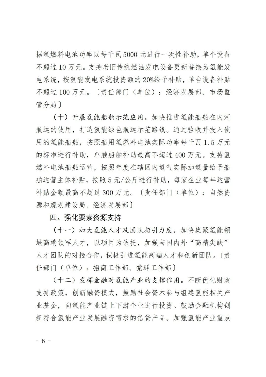 開展氫能船舶示范應(yīng)用。加快推進(jìn)氫能船舶在內(nèi)河航運(yùn)的使用,打造氫能綠色航運(yùn)示范路線。通過(guò)驗(yàn)收并投入使用的氫能船舶,按照船用氫燃料電池實(shí)際功率每千瓦1.5萬(wàn)元的標(biāo)準(zhǔn)進(jìn)行補(bǔ)助,單艘船舶補(bǔ)助最高不超過(guò)400萬(wàn)元。支持氫燃料電池船舶運(yùn)營(yíng),按照年度在轄區(qū)內(nèi)氫氣實(shí)際加氫量給予船舶運(yùn)營(yíng)主體補(bǔ)貼,按照5元/公斤進(jìn)行補(bǔ)助,每家企業(yè)每年運(yùn)營(yíng)補(bǔ)貼金額最高不超過(guò)300萬(wàn)元。
