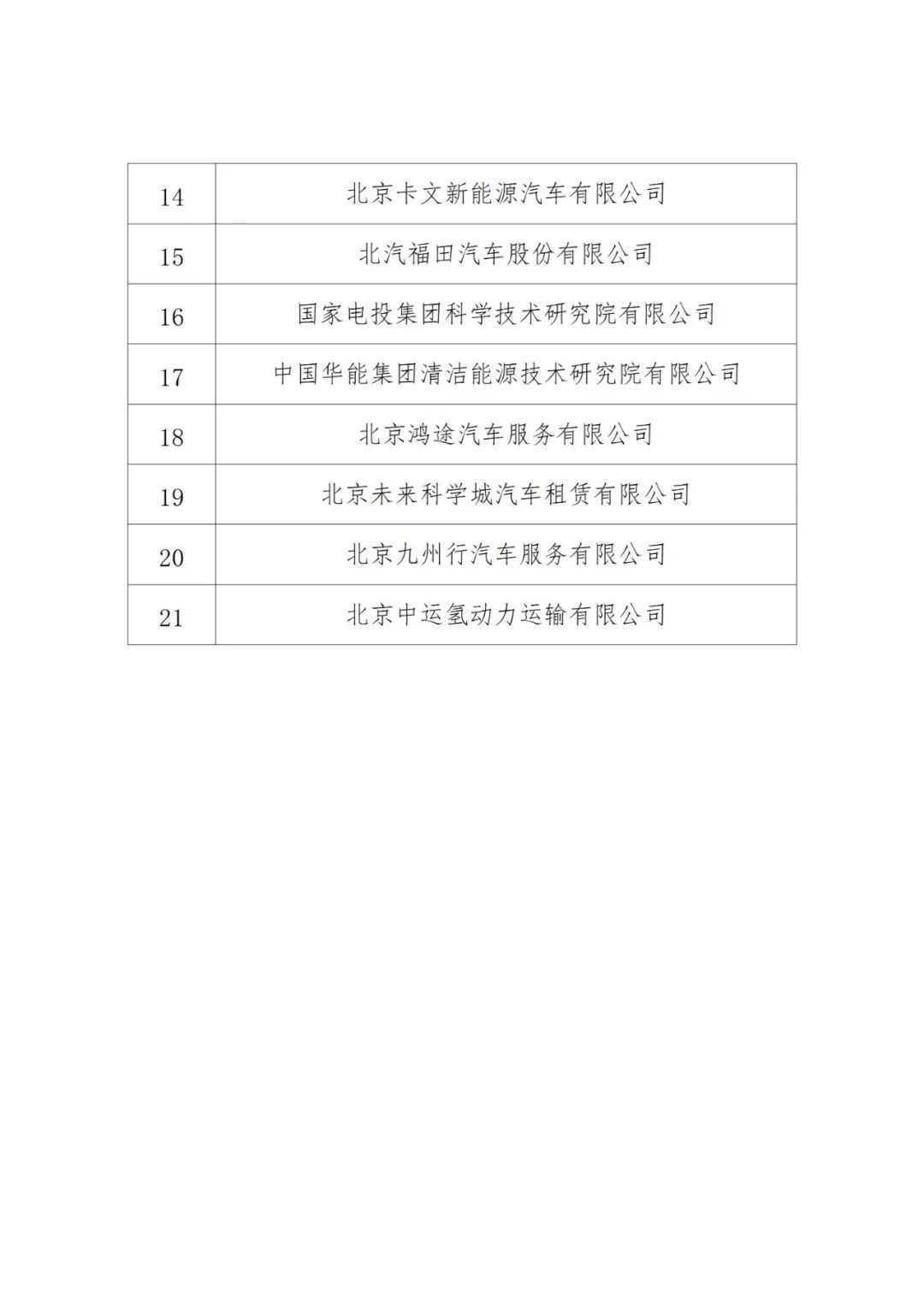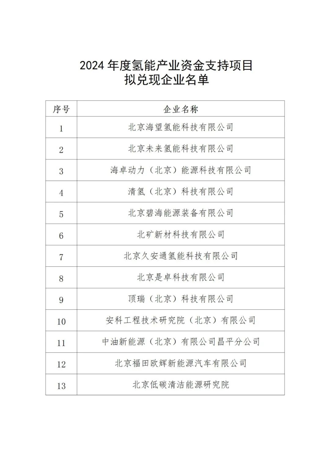 根據企業名單,擬兌現企業有21家,分別是北京海望氫能科技有限公司、北京未來氫能科技有限公司、海卓動力(北京)能源科技有限公司、清氫(北京)科技有限公司、北京碧海能源裝備有限公司、北礦新材科技有限公司、北京久安通氫能科技有限公司、北京是卓科技有限公司、頂瑞(北京)科技有限公司、安科工程技術研究院(北京)有限公司、中油新能源(北京)有限公司昌平分公司、北京福田歐輝新能源汽車有限公司、北京低碳清潔能源研究院、北京卡文新能源汽車有限公司、北汽福田汽車股份有限公司、國家電投集團科學技術研究院有限公司、中國華能集團清潔能源技術研究院有限公司、北京鴻途汽車服務有限公司、北京未來科學城汽車租賃有限公司、北京九州行汽車服務有限公司、北京中運氫動力運輸有限公司。