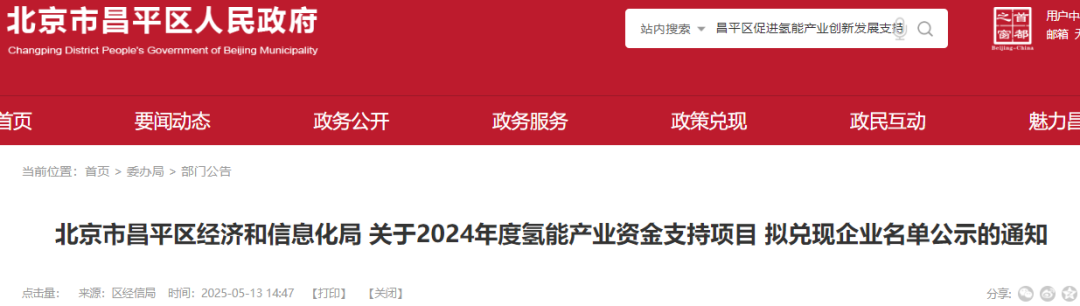 近日,北京市昌平區經濟和信息化局發布關于2024年度氫能產業資金支持項目擬兌現企業名單公示的通知。
