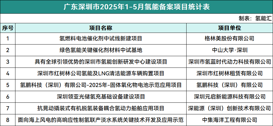 廣東深圳市氫能備案項目8個。