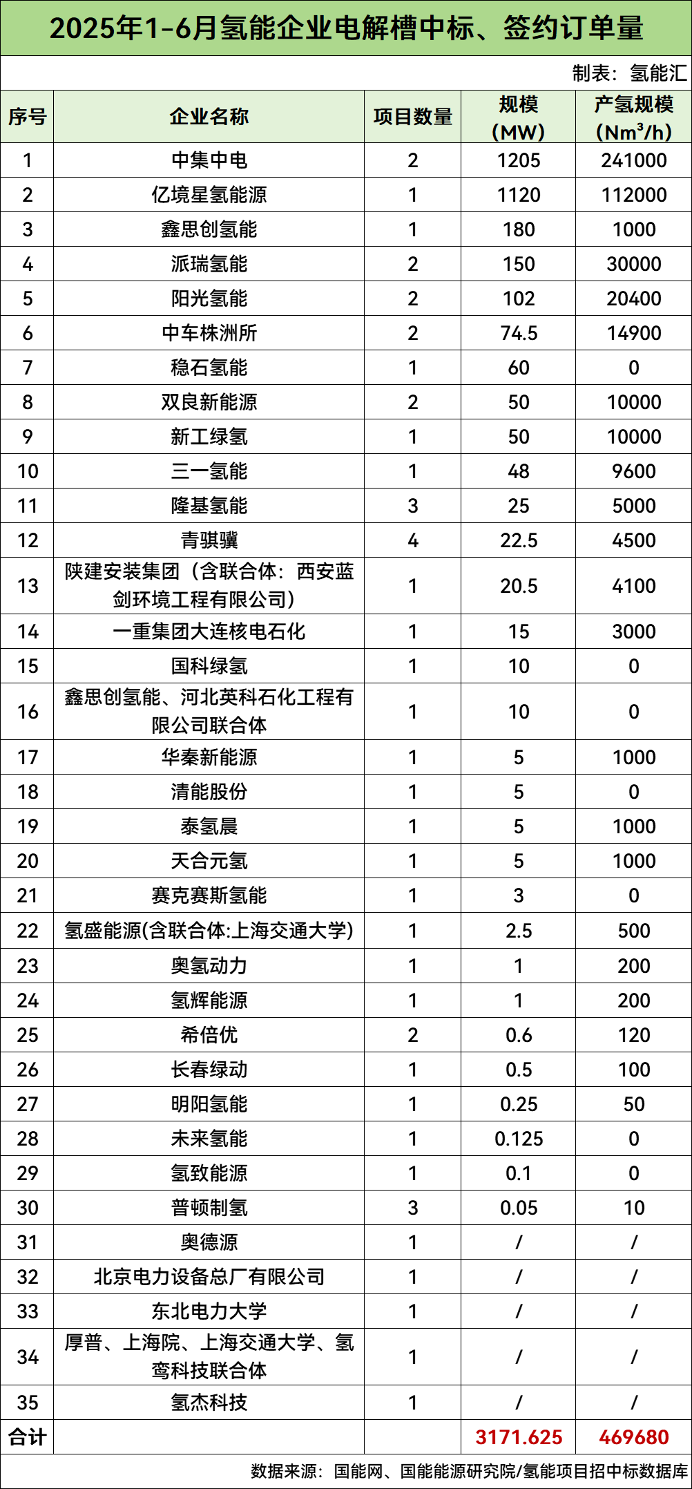 氫能匯根據(jù)氫能項(xiàng)目數(shù)據(jù)庫(kù)統(tǒng)計(jì)顯示,2025年1-6月全國(guó)電解槽中標(biāo)、簽約訂單量總計(jì)3171.625MW,獲得電解槽訂單量的企業(yè)共有35家。