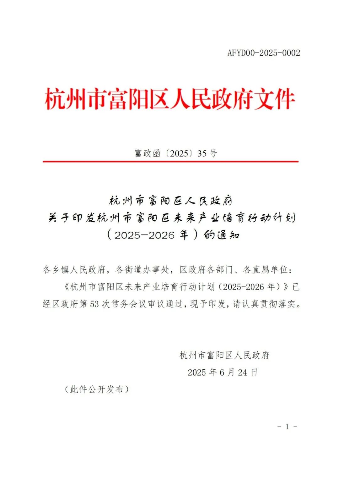 近日,杭州市富陽區(qū)人民政府關(guān)于印發(fā)杭州市富陽區(qū)未來產(chǎn)業(yè)培育行動(dòng)計(jì)劃(2025-2026年)的通知。