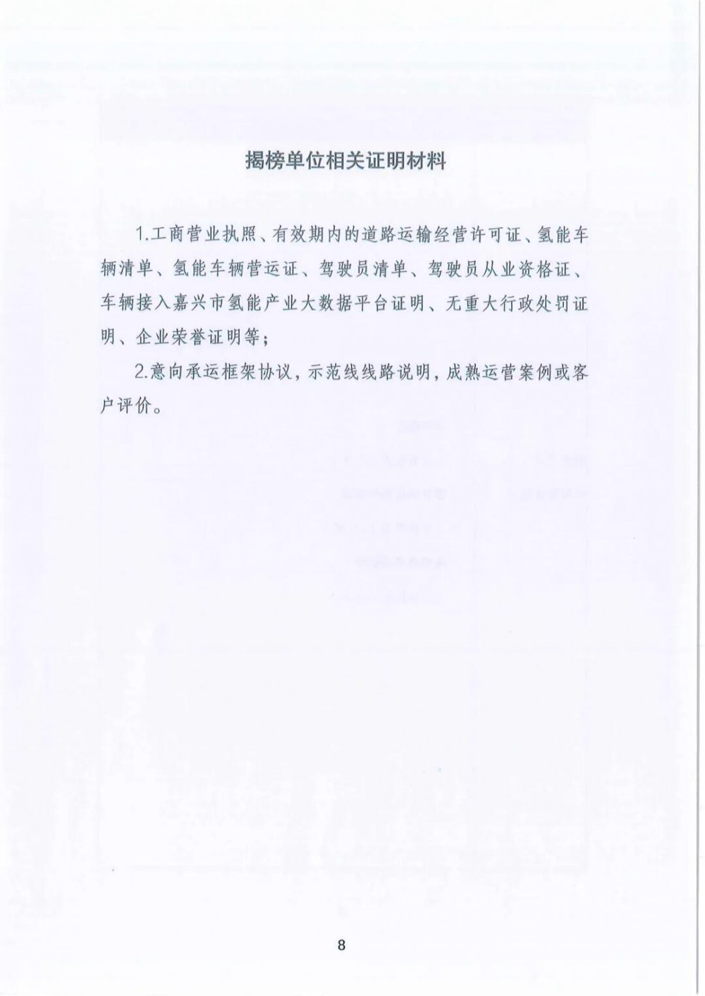 要求申報(bào)單位須具備道路運(yùn)輸經(jīng)營(yíng)資質(zhì)。需具備規(guī)模化營(yíng)運(yùn)能力,車輛要求接入嘉興市氫能產(chǎn)業(yè)大數(shù)據(jù)平臺(tái),并有成熟運(yùn)營(yíng)案例或客戶評(píng)價(jià)。