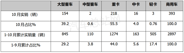 上表顯示,在今年10月單月燃料電池商用車終端銷量中: