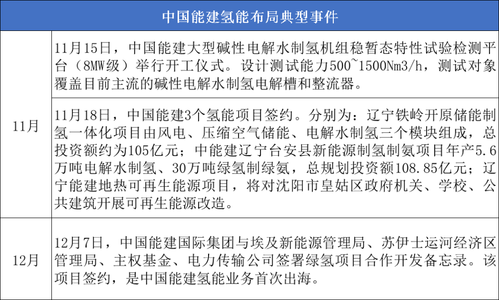 中國能建是一家為能源電力、基礎(chǔ)設(shè)施等行業(yè)提供整體解決方案、全產(chǎn)業(yè)鏈服務(wù)的綜合性特大型集團公司。公司依托氫能公司開展氫能前端技術(shù)研究、探索氫能商業(yè)模式、全面布局氫能產(chǎn)業(yè)鏈,正在努力推進氫能在工業(yè)、建筑、交通等主要終端領(lǐng)域的低碳化應(yīng)用,并完善“風光儲充換氫”供能體系。近期布局事件如下: