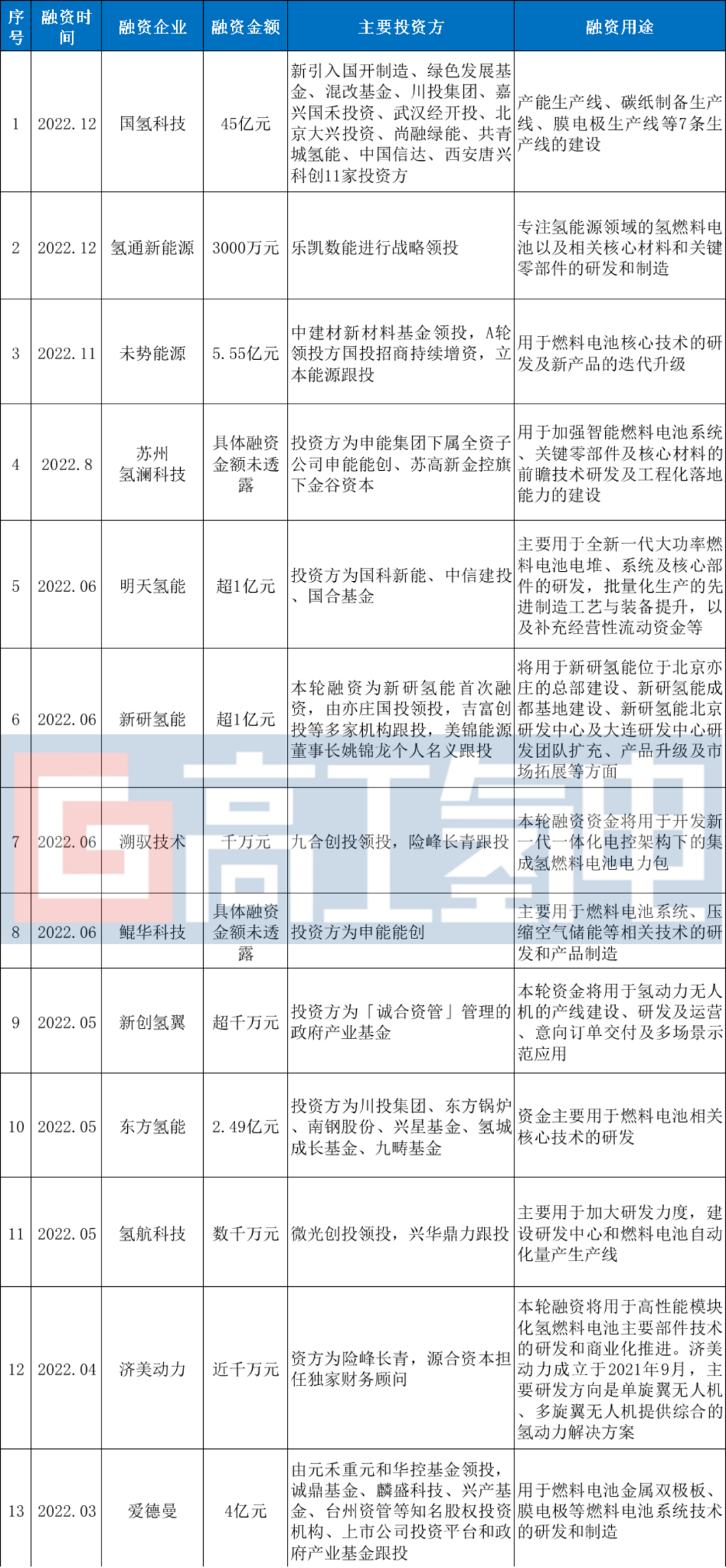 今年以來,據不完全統計(根據公開信息整理,或有遺漏),已有國氫科技、未勢能源、愛德曼、明天氫能、新研氫能、鯤華科技、氫途科技、東方氫能、氫航科技、溯馭技術、濟美動力、新創氫翼、蘇州氫瀾科技、氫通新能源等14家燃料電池企業展開融資,總金額超過60億元。詳情如下表: