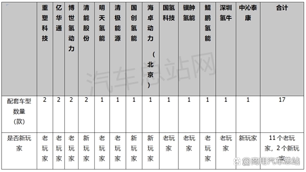 本批次目錄上榜的燃料電池商用車共計17款車型,有13家燃料電池企業參與配套。