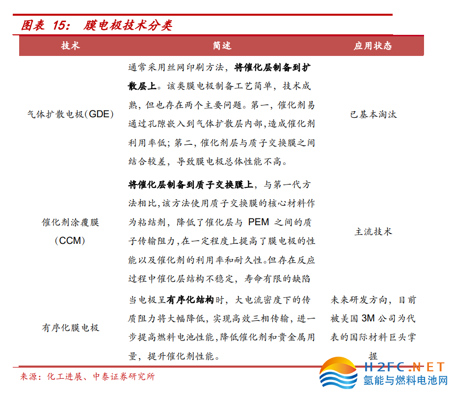 第二 代技術為催化劑涂層(CCM),將催化層改為制備到質子交換膜上,與 GDE 相比,提高了催化劑利用率和耐久性,減少了催化層和質子交換膜 之間傳輸阻力,從而提高了膜電極性能,成為當前膜電極生產的主流技 術,但存在反應過程中催化層結構不穩定,壽命有限的不足。第三代有序化膜電極,運用有序化結構,可以減少催化劑和貴金屬用量,提高催 化層性能,目前該技術處于研發階段,目前技術被以美國 3M 公司為代 表的國際材料巨頭所掌握。